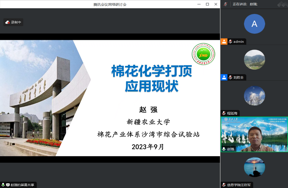 赵强教授的学术报告《棉花化学打顶技术》主要介绍了棉花化学打顶的概念、作用、意义,理想的化学打顶棉田表现与结铃特点以及目前化学打顶技术的推广应用情况。报告分析了一些化学打顶剂存在的问题及其对棉花产量形成的影响,最后,赵教授对如何更好使用化学打顶技术给出了建议。