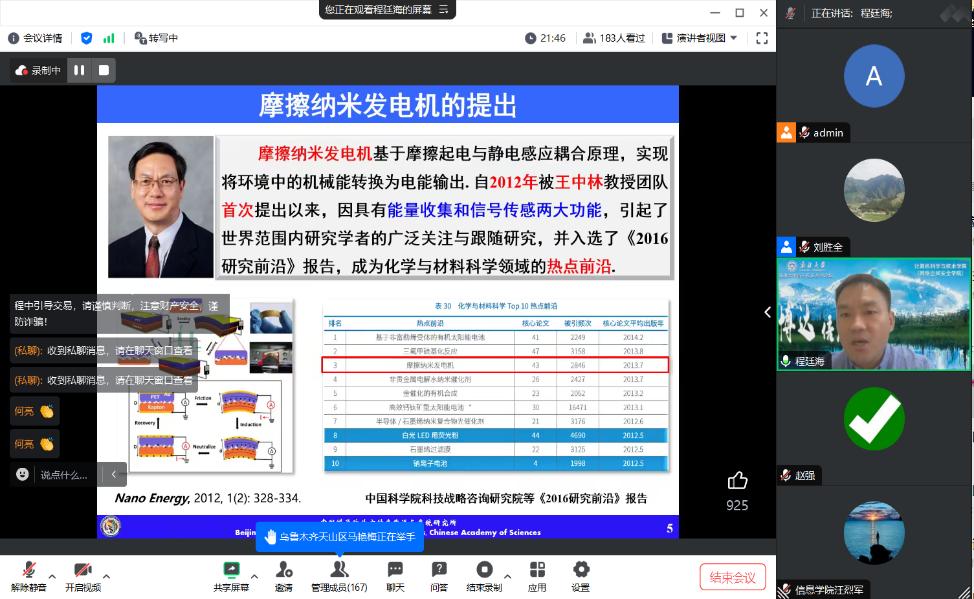 程廷海研究员的报告《基于纳米发电机的微纳能源俘获与自驱动智能传感》重点介绍了团队所发明的摩擦纳米发电机。针对自然环境能量的低品位特性,提出了系列机械模式纳米发电机的设计思想。此外,利用摩擦纳米发电机的自驱动传感特性,提出了多种原理和结构形式的智能传感器件,实现了智能传感器件对直线、旋转等典型机械运动、振动以及流体状态的实时智能监测。最后,报告展望了纳米发电机未来在工程技术、智慧农业等领域的应用与发展。
